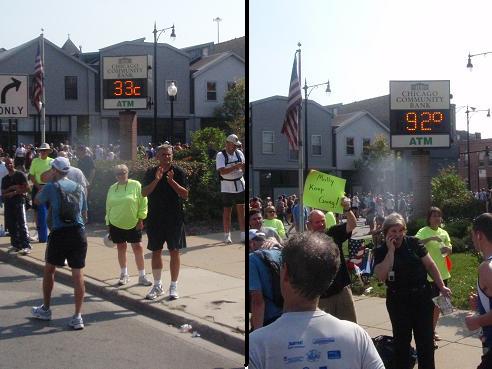 33°C. 92°F. Und dazu eine schier unglaubliche Luftfeuchtigkeit von 70,5%. Das bewirkte, daß die natürliche Körperkühlung durch Schweiß nahezu wirkungslos war. In der Sonne wurden gar 42°C gemessen. Das war auch fast die Körpertemperatur der meisten Läufer, die ins Krankenhaus oder gleich auf die Intensivstation kamen. |