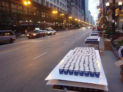 Downtown Chicago, Ecke State / Madison 6.54 Uhr Die Vorbereitung auf den Ansturm der Läufer. In drei Etagen wurde das Wasser gestapelt. Bei der Hitze hätte ich am Liebsten jetzt schon zugeschlagen, hatte aber noch Zugriff auf meine eigenen Reserven. |