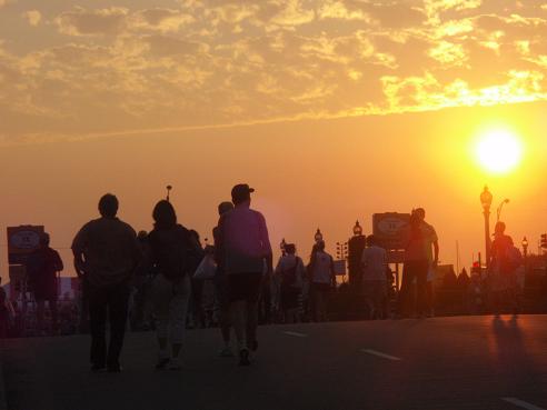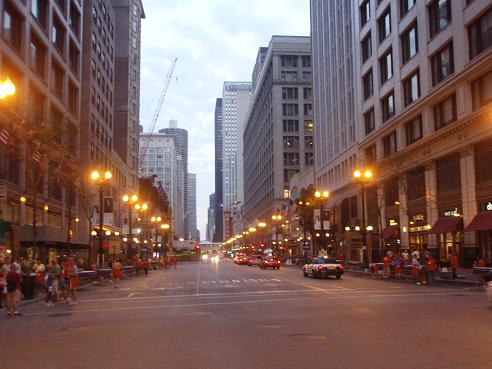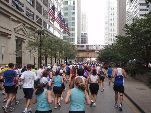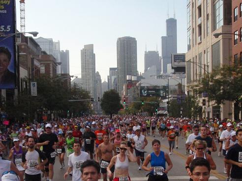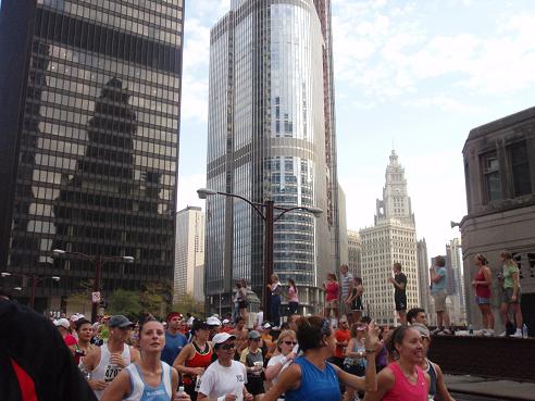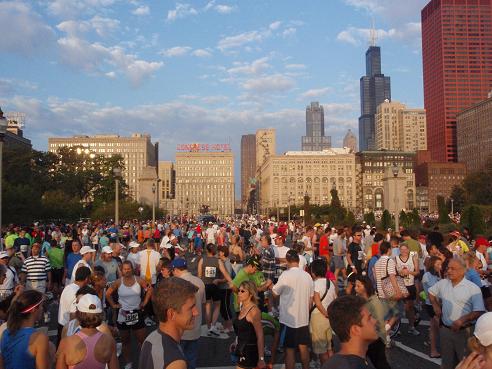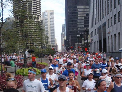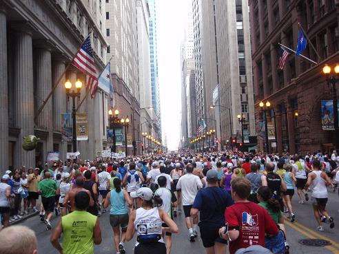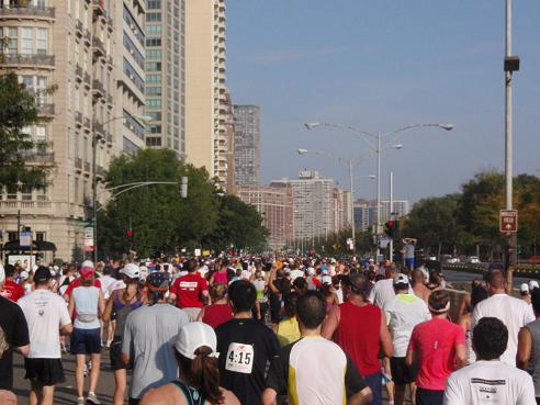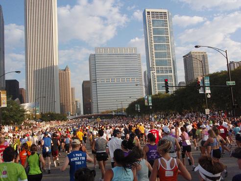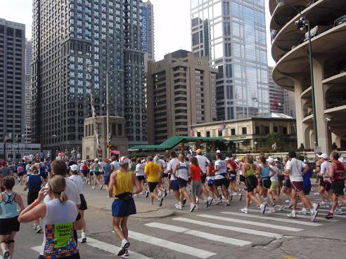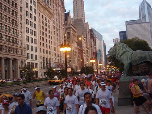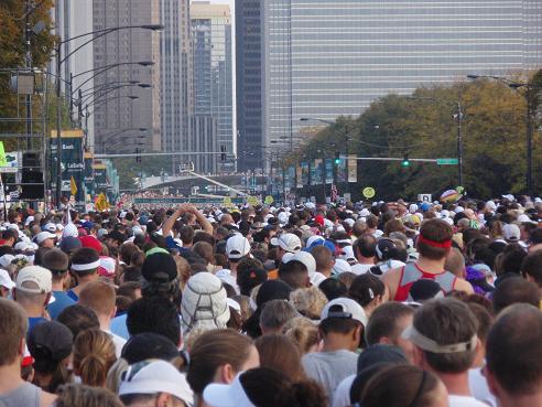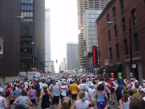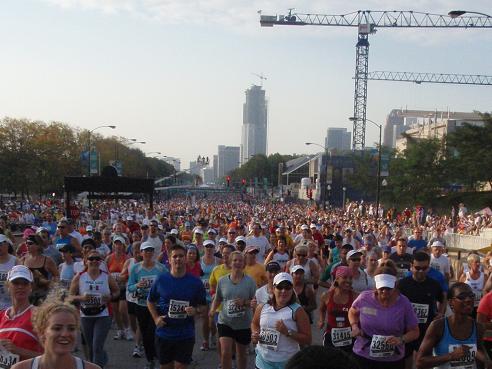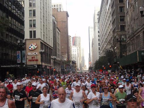 South Michigan Avenue 7.03 Uhr Ansturm der Läufer in Richtung Start. Trotz der Masse von 35.867 Läufern ging es sehr geordnet und übersichtlich zu. |
