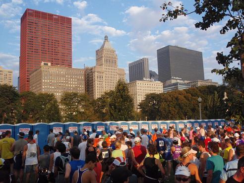 Grant Park 7.45 Uhr Das übliche Warten vor den Toilettenhäuschen. Aber nicht bei jedem Marathon hat man einen solchen imposanten Hintergrund. |