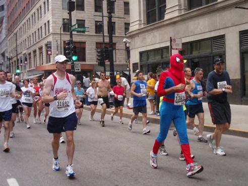 North LaSalle Street Meile 2,7 / 8.43 Uhr Spider-Man! Was macht der in Chicago? Gehört der nicht nach New York? Und viel wichtiger: Wo ist Mary Jane??? Also ehrlich: Bei Wetter auch noch im Kostüm zu laufen ist echt Wahnsinn. Aber nicht unmöglich. Im Ziel traf ich einen Mann, der das Rennen in einem körperhohen und meterbreiten Zahn (!!!) lief. Aus Pappmasche. |