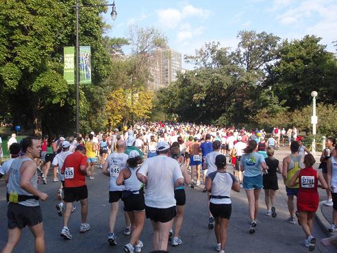 South Columbus Drive 7.59 Uhr Die Sekunden vor dem Start. Die Elite stand 500 Meter vor mir. In meinen Startblock (10 Min/Meile) hatte ich es nicht mehr geschafft, lief also einen Block weiter hinten los (11 Min/Meile). |