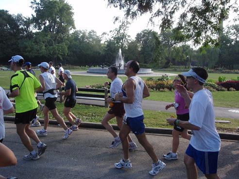 Stockton Drive, Lincoln Park Meile 5,3 / 9.09 Uhr Noch war hier keiner so durstig, als daß er zum Brunnen im Hintergrund abgebogen wäre. Später würden hunderte Läufer aus Wassermangel den Brunnen stürmen und sich an dem nicht wirklich als Trinkwasser gedachten Naß den Magen verderben. |