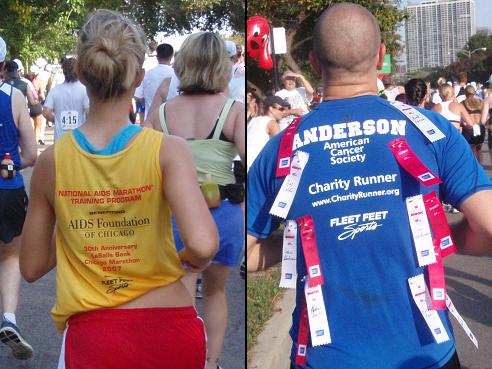 Stockton Drive, Lincoln Park Meile 5,4 / 9.10 Uhr Sehr viele Läufer widmeten das Rennen einem guten Zweck. Allen voran waren die Läufer für die Krebshilfe (rechts) und die AIDS Foundation (links). Aber auch am Rand waren sehr viele Zuschauer mit entsprechenden Plakaten und Sammelbüchsen unterwegs. |