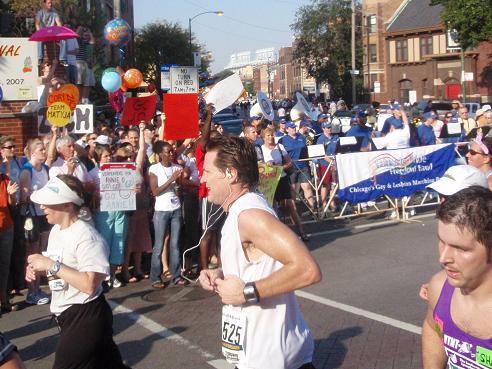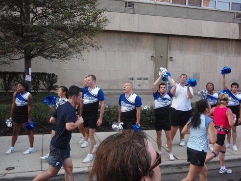 West Addison Street Meile 7,5 / 9.30 Uhr Männliche Cheerleader! Was es nicht alles gibt. Nach dem langen Lauf in der Sonne war der kurze Schatten recht angenehm, half aber auch nur bedingt weiter. Um mich herum gab es mehr und mehr Läufer, die schon jetzt nur noch gehen konnten oder sich an den Straßenrand setzten. |
