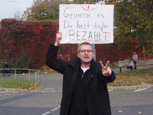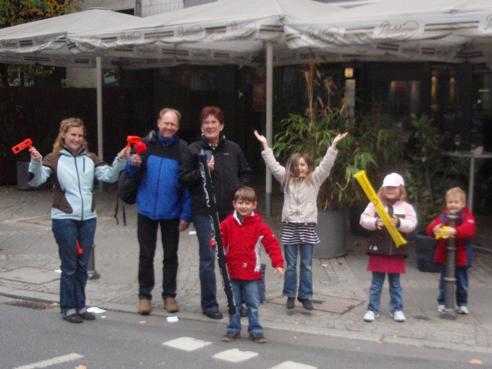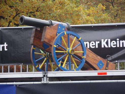 28. Oktober 2008 8.35 Uhr / Messe Frankfurt Die Startkanone, die kurz darauf das Feld auf die Reise schicken wird. Das Wetter spielte mit. Es war zwar bedeckt, aber trocken. Von Sonne war nicht viel zu sehen, aber es war mit Anfangs um die 9°C und später 12 bis 13°C sehr angenehm. Auch und insbesondere in meinem Elch-Kostüm. |