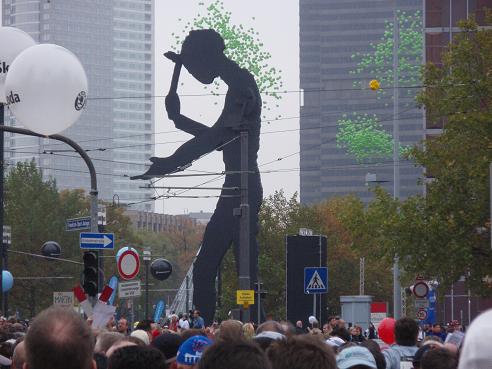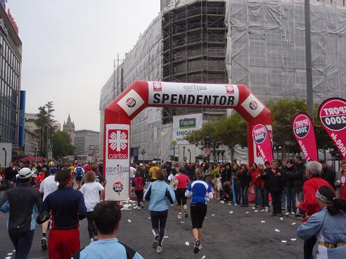 | Hauptwache/Zeil Kilometer 10 / 11.10 Uhr Hier eine nette Idee. Wer rechts durch Tor lief, spendete dank Chip am Fuß automatisch 3,- Euro für "Gemeinsam mehr bewegen", eine Initiative der Caritas für Kindertagesstätten. Bei Kilometer 38 kam man hier noch einmal vorbei und konnte noch einmal 3,- Euro spenden. ich lief zweimal durch. |