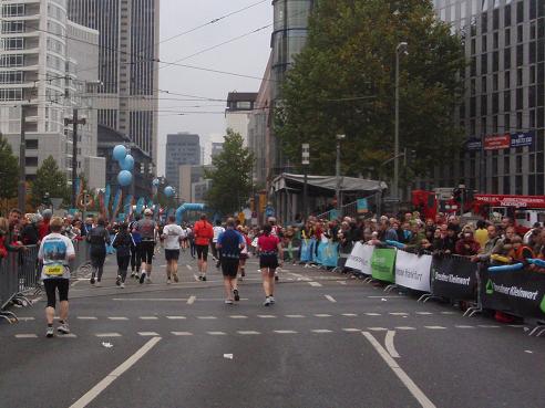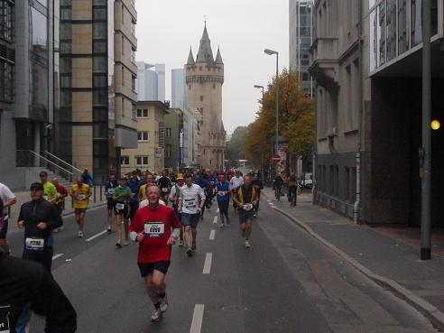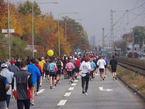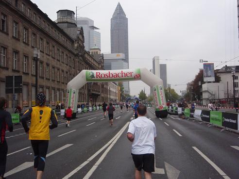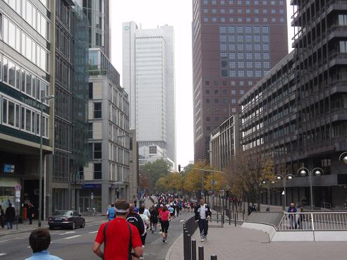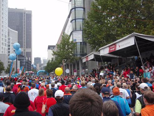 | Friedrich-Ebert-Anlage Kilometer 0 / 10.00 Uhr Der Startschuß ist gefallen. Rund 18.000 Läufer (gut ein Drittel als Staffelläufer) machen sich auf den Weg durch Frankfurt. Ich startete noch mit den leichten Nachwirkungen einer Erkältung, die ich mir 17 Tage zuvor noch in Chicago aufgehalst hatte und die mich nach dem Chicago-Marathon nur einmal hatte trainieren lassen. |