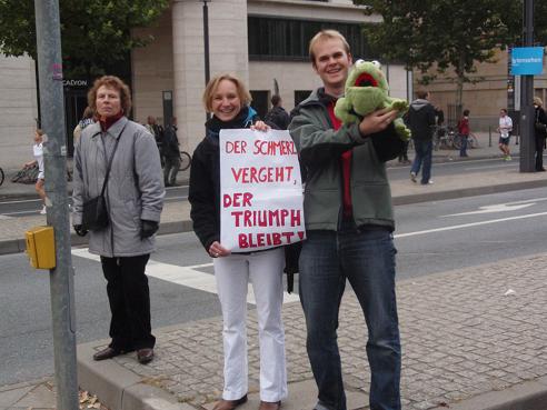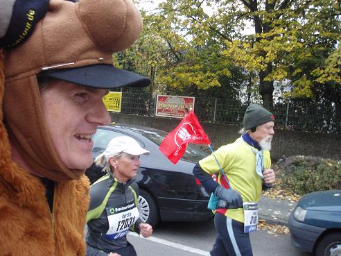 Weg Kilometer 4 / 10.34 Uhr Das Hamburger Duo. Lothar mit der Fahne und ich im Elch. Wo die Dame in der Mitte herkam, weiß ich nicht. |