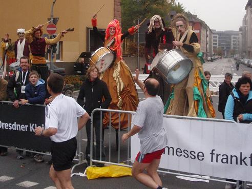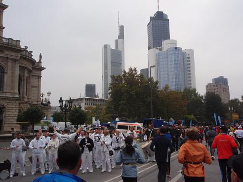 Anlage / Alte Oper Kilometer 5 / 10.39 Uhr Samba-Party an der Alten Oper. Bei weitem nicht die einzige Band an der Strecke. ich kam gut los, steigerte mein Tempo bis in die Nähe von 6:00 Min/Km. Gerade bei dem langen Anstieg zu Kilometer 4 schien mir das etwas schnell, aber ich fühlte mich gut. |