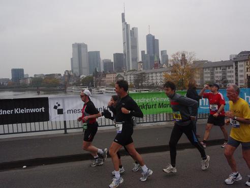 Brücke Kilometer 12 / 11.22 Uhr Nun ging es über den Main mit dem grandiosen Blick auf die Skyline von Frankfurt. Naja... ist nicht Chicago, aber auch sehr beeindruckend hoch für mich als Hamburger. |