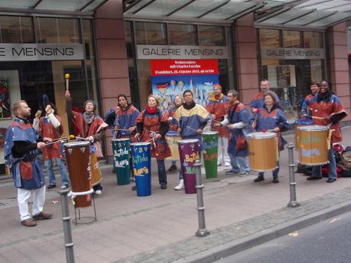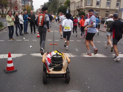 | Kaiserstraße Kilometer 37,5 / 14.15 Uhr Noch eine Musikgruppe, die unermüdlich auf die Trommeln haute. Die meisten Bands (nicht alle) hielten tatsächlich durch. Zumindest bis ich kam. Und je später auf der Strecke, desto länger mußten die ja auch auf mich warten. |