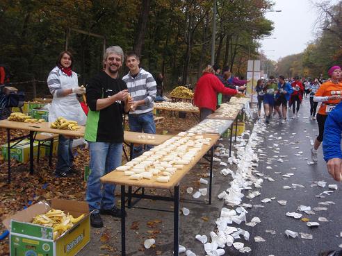Landstraße Kilometer 16 / 11.43 Uhr Die ersten Bananen. Das muß eine ziemliche Sau-Arbeit sein, Tausende von Bananen zu schälen und klein zu schneiden. Und das immer im Wettlauf mit dem Hunger der Läufer. Es ist schon ein Wahnsinn, wie viele Helfer sich immer wieder für diese Arbeiten finden. Ohne diese ganzen freiwilligen Engel könnten gar nicht Marathon laufen. Danke Schön!!!!! |