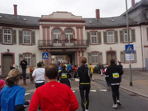 | Frauenhofschule Kilometer 16 / 11.47 Uhr Da ging es mitten durchs Gebäude hindurch. Nette Einlage und eine schöne Umgebung generell. Ein bisschen wenig Zuschauer zwar auf dieser Ecke, aber schön anzusehen. Hier ist eine der Ecke, die durch die Streckenreform in den Kurs genommen wurden. letztes Jahr liefen wir hier noch eine längere Runde. |