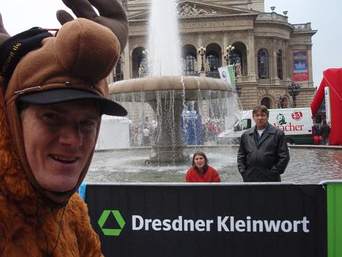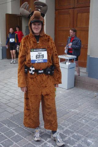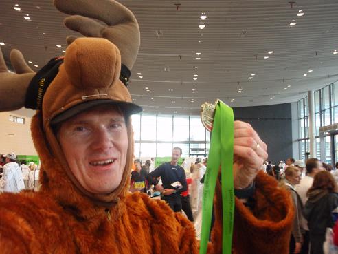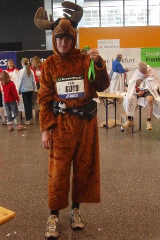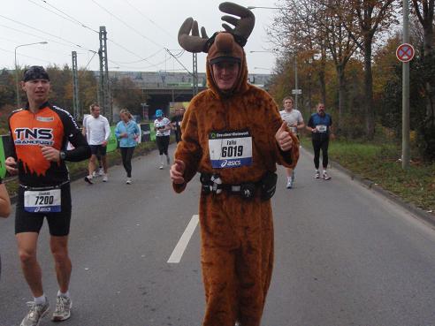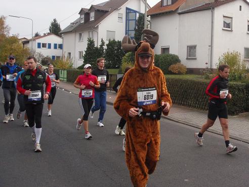Frankenfurt Kilometer 20 / 12.14 Uhr Eines der Fotos, die ein netter Mitläufer von mir machte. Gegenüber dem Hamburg-Lauf hatte ich das Kostüm noch etwas optimiert. Den Kopf stabilisierte ich durch eine eingearbeitete Schirmmütze und die Ohren mit Stirnbändern. So standen die Geweihe jetzt aufrecht und die Kapuze rutschte nicht mehr nach hinten weg. Es wurde aber auch etwas schwerer am Kopf. Aber nicht unangehm. |