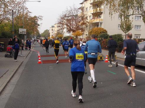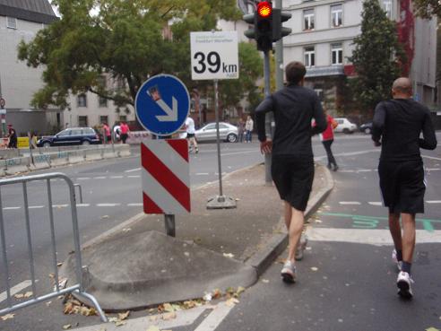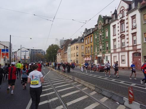 | Bolongarostraße Lilometer 25,5 / 12.46 Uhr Damit hatten wir Frankfurt- Höchst und somit den westlichsten Teil der Strecke erreicht. Psychologisch schlecht: Im Jahr zuvor war die Strecke identisch an dieser Stelle, da war hier aber schon Kilometer 28,5 und die auf der Gegenseite hatten sogar schon Kilometer 30 passiert. Genau 2,9 Kilometer hinkte man nun gedanklich hinterher. |