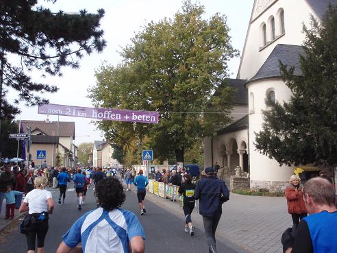 | Martinskirchstraße Kilometer 21,4 / 12.19 Uhr "... noch 21 km hoffen + beten". Das Banner über der Straße an der Martinuskirche paßte genau. Aber mir war schon klar, daß ich auch mit Gottes Hilfe mein Tempo nicht würde halten können. Aber die Beine weigerten sich weiter strikt, das Tempo zu drosseln. Ich kriegte es einfach nicht hin. |