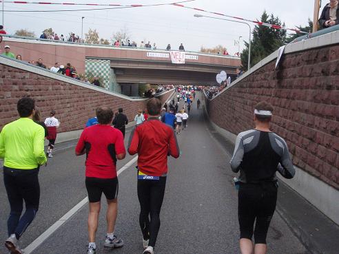 Anlage Kilometer 39 / 14.28 Uhr Ich hatte fertig. Die häßliche Steigung Bleichstraße (warum denn auch die zweimal laufen??) hatten mich die Zuschauer noch raufgeschrieen, aber hier war es vorbei. Ich fing an zu gehen. Es ging einfach nicht mehr. Die Hitze- schlacht von Chicago 21 Tage zuvor und die frisch überstandene Erkältung machten sich jetzt doch bemerkbar. Das war dann doch ein paar Kilometer zu viel. |