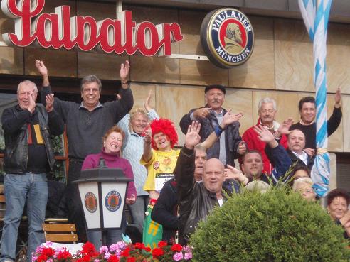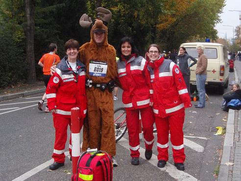 | Frankenallee Kilometer 34 / 13.47 Uhr Gruppenfoto mit Helfern. Also ich hatte ja gesagt, ich würde mich nie in die Hände der Ersthelfer gegeben wollen, aber hier machte ich natürlich mal eine Ausnahme. Und wenn die nichts anderes zu tun haben, als Fotos mit Elchen zu machen, dann war es wohl ein guter Tag für die Läufer. Ich habe jedenfalls nur sehr selten mal die Sirenen von den Krankenwagen gehört. |