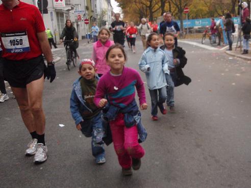 | Frankenallee Kilometer 33 / 13.41 Uhr Mein Fanclub auf Verfolgungs- jagd. Hier in der Nähe lief auch ein Clown, aber der war an dieser Stelle zu schnell für den Nach- wuchs. So hing man sich an mich ran. Die Kleinen hielten gut 500 Meter mit. Gar nicht schlecht. |
