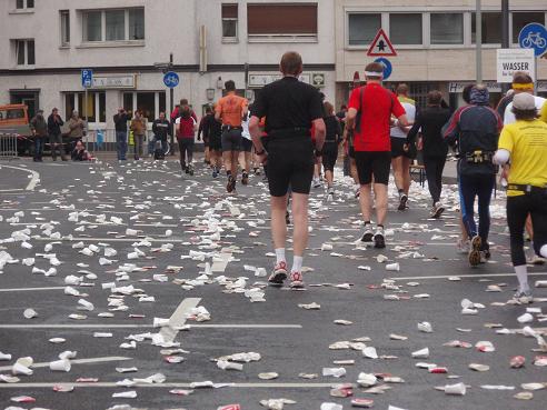/ Güterplatz Kilometer 34 / 13.52 Uhr Hinter dem Verpflegungsstand. Das typische Bild zertretener Becher. Ich hatte mich ein weiteres Mal mit Coca-Cola eingedeckt. Mein Kreislauf schrie geradezu nach mehr Zucker und mit frischer Coca-Cola im Bauch lief es sich einige Zeit auch deutlich besser. Wunderlich nur, daß mein Magen das mitmachte. |