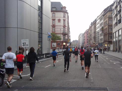 | Taunusstraße Kilometer 37 / 14.11 Uhr Schweren Schrittes trabte ich durch die Frankfurter City. So drei Stunden zuvor war ich schon einmal hier gewesen und da hatte es mir dort auch nicht gefallen. Damals war das Km 37 auch noch so richtig frustirierend. |