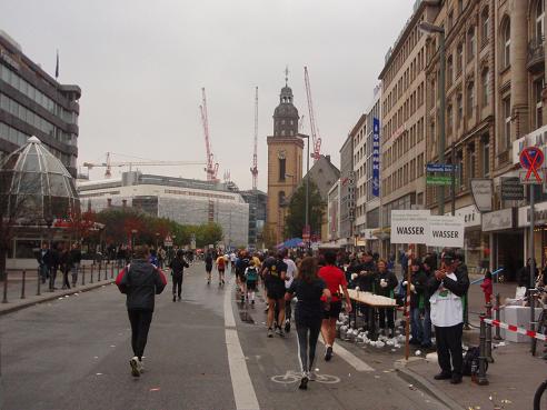 | Rossmarkt Kilometer 38 / 15.18 Uhr Die vorletzte Wasserstelle hier vor der Hauptwache (voraus links) und der Katharinenkirche. Auch hier spielten noch zwei Bands. Die Zuschauer standen allerdings alle 100 Meter weiter an der Zeil. Da war wieder richtig toll was los. |