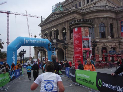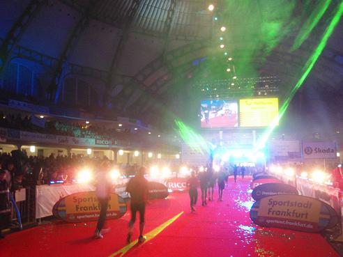 Frankfurt Kilometer 42,1 / 14.55 Uhr Der Höhepunkt des Frankfurt- Marathons ist ohne Frage der einmalige Zieleinlauf in der Festhalle. Die Stimmung und die Lichtshow sind grandios, auch wenn man im ersten Moment gar nicht so viel sehen kann, wenn man von draußen in die Halle einläuft. |