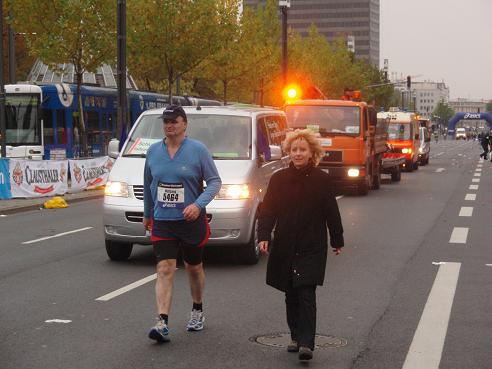 | Friedrich-Ebert-Anlage 16.25 Uhr Der letzte Läufer des diesjährigen Frankfurt-Marathons mit dem Besenwagen und etlichen anderen Wagen im Schlepptau. Ankommen ist alles!! Denn: "Der Schmerz vergeht, der Triumph bleibt!" (siehe Foto weiter oben). |