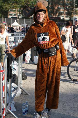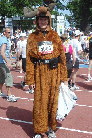 anderen Nationalitäten mein Jubiläum gefeiert zu haben. Passend zu Schweden habe ich das Elch-Kostüm ausgepackt. Bei den Temperaturen von bis zu 27°C und der brütenden Sonne vielleicht nicht so unendlich klug, aber mit ruhigem Laufstil, der Unterstützung der begeisterten und begeisternden Zuschauer und mit ganz ganz viel Trinken habe ich es geschafft. Die Endzeit von 4:25:04 Stunden war mein fünftschnellster Marathon überhaupt, wobei ich ganz gemütlich und trotz eines im Rennen (bei Km 30) abgebrochenen Zehennagels durchgehend ein Tempo von 6:13 Min/Km auf Stockholms Straßen gelegt habe. |
