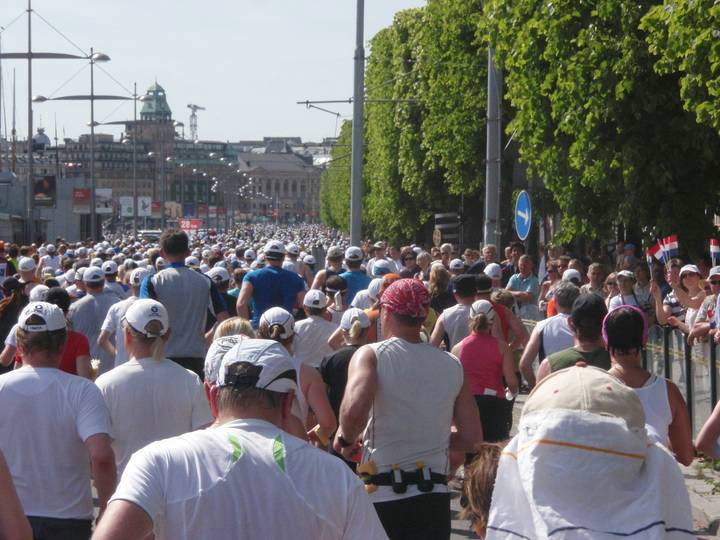 8 / 14.53 Uhr Hamngatan / Norrmalmstorg Hier wie fast überall in der Stadt standen die Leute reihenweise und feuerten die Läufer an. Ich bekam immer wieder lautstarke "Älgien! Älgien!"-Rufe zu hören, was für Elch steht, aber wie Alien klingt. Naja... an dem Tag hatte ich ja auch etwas von einem Außerirdischen. |