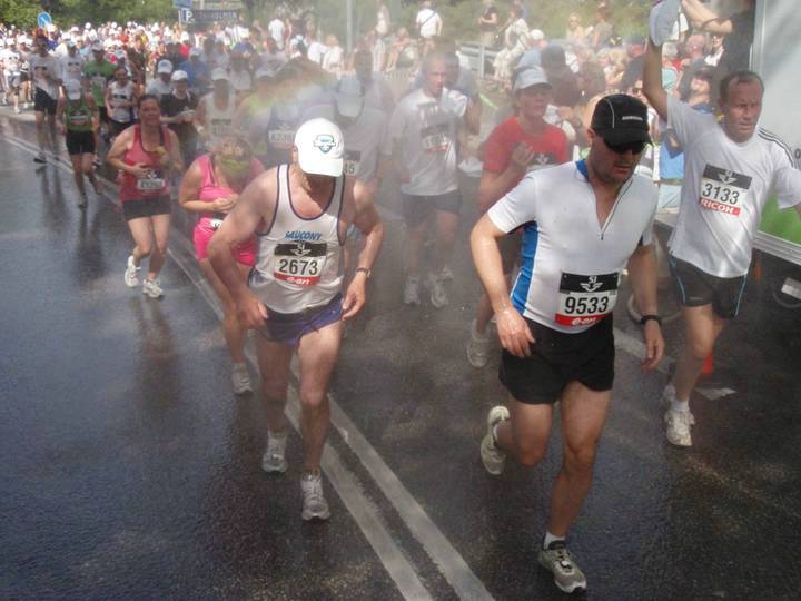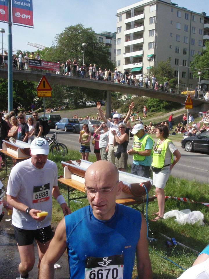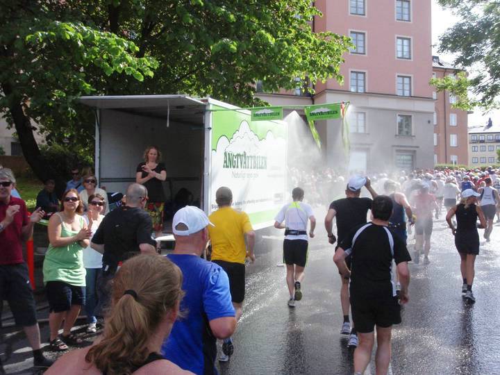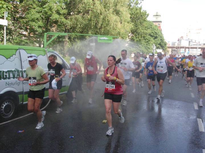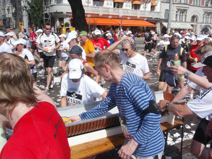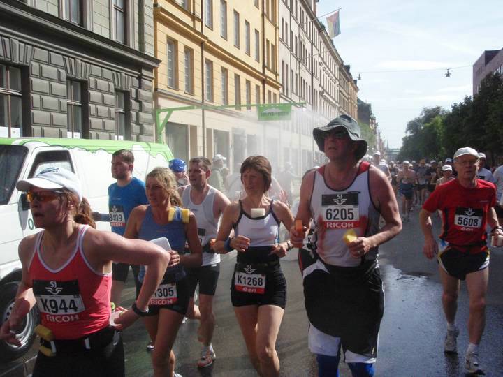 7,5 / 14.51 Uhr Strandvägen Von Anfang an suchten die Läufer jede Chance zur Abkühlung. Die Organisatoren hatten am Ende jeden Verpflegungspunktes noch zusätzliche Wasserstellen zum Erfrischen aufgestellt, die ständig mit frischem und kaltem Wasser nachgefüllt wurden. Mir im Elch-Kostüm half das nicht ganz so gut. :-) |