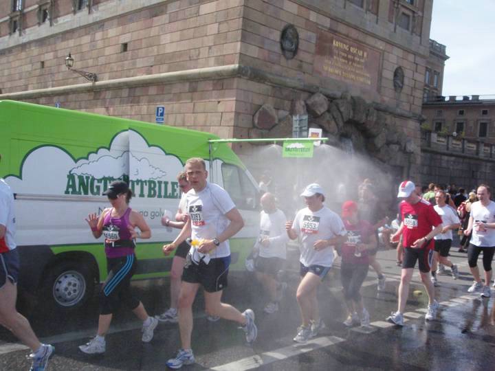 8,5 / 14.58 Uhr Skeppsbron Noch so eine tolle Idee von den Organisatoren. So gab es alle paar Kilometer diese Duschwagen mit Abkühlung. Auch die half mir im Elch-Kostüm nicht so sehr weiter. Damit konnte ich nur das Geweih schwerer machen. Ich hielt mich an meine Devise: langsam laufen und trinken, trinken, trinken. |