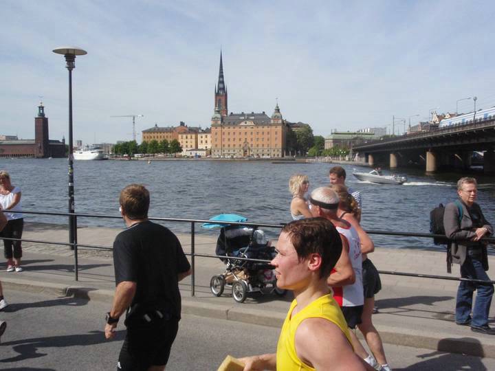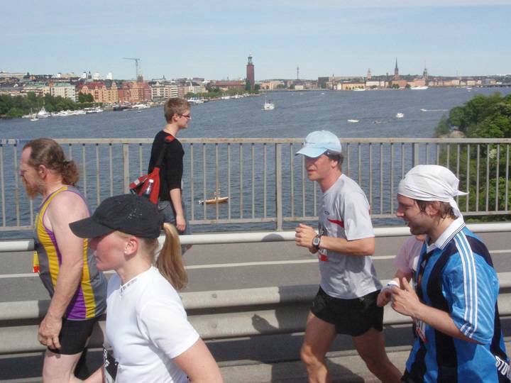 12 / 15.20 Uhr Västerbron Was für eine Aussicht. Das sind so die Momente, da vergißt man Tempo und Hitze und Taktik und die ganze Anstrengung. Da freut man sich einfach nur, daß man Läufer ist. |