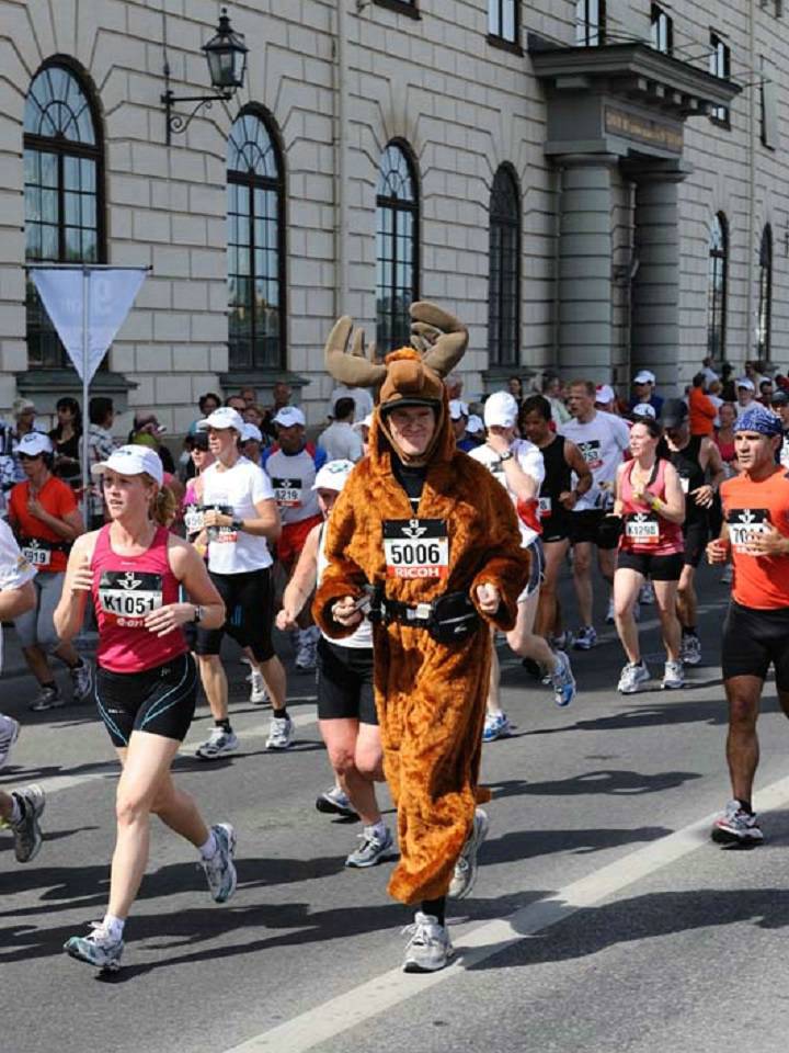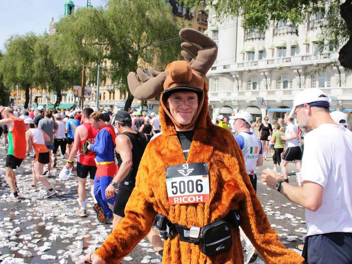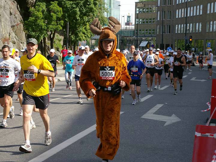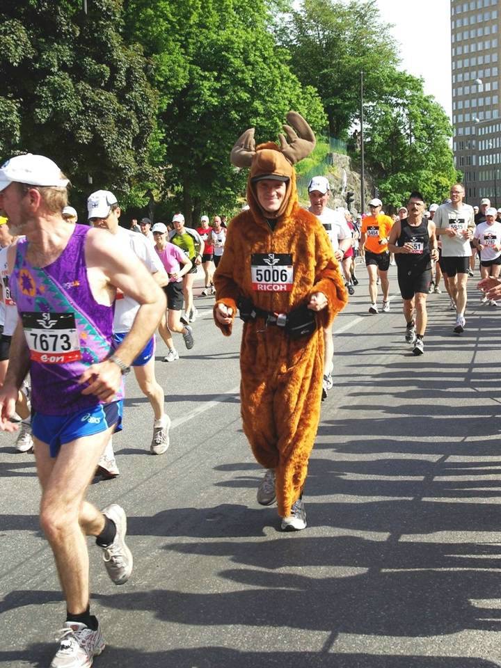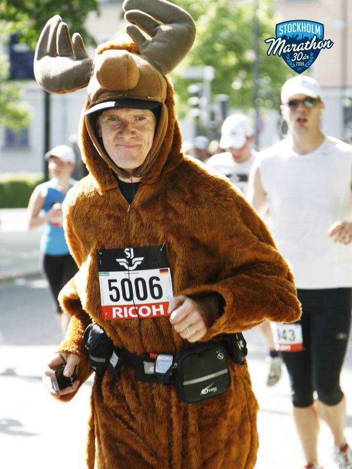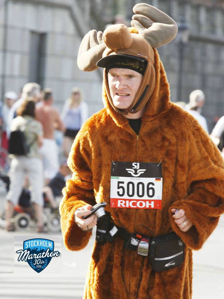 17 / 15.47 Uhr Torsgatan Da bin ich mit dem Elch-Kostüm. Kein Wunder, daß ich auffiel. Es gab im Starterfeld überhaupt sehr wenig Kostüm-Läufer. Ich sah noch einen Superman, drei Leute im Anzug, einen mit Baströckchen und drei Hawaiianer. Foto: Jacob M Roupe |