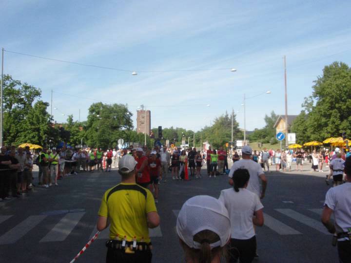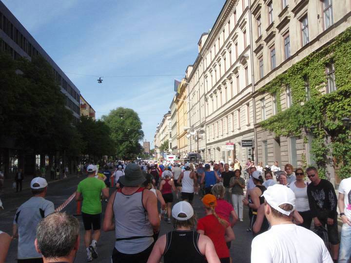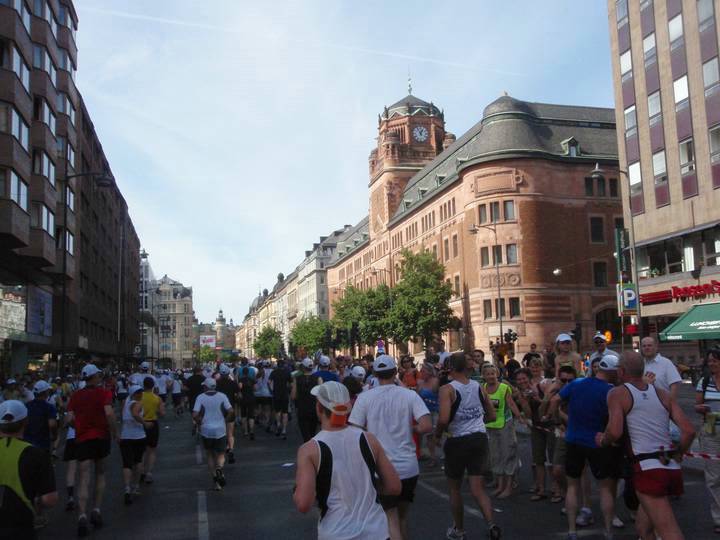 20 / 16.10 Uhr Sturegatan Vor uns das Olympiastadion. Aber es ging noch nicht links ab für uns, sondern rechts in eine weitere Runde, die zudem zwei Kilometer länger als die erste werden sollte. Die vierten fünf Kilometer rannte ich in 31:16 Min (6:15 Min/Km). |