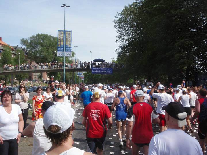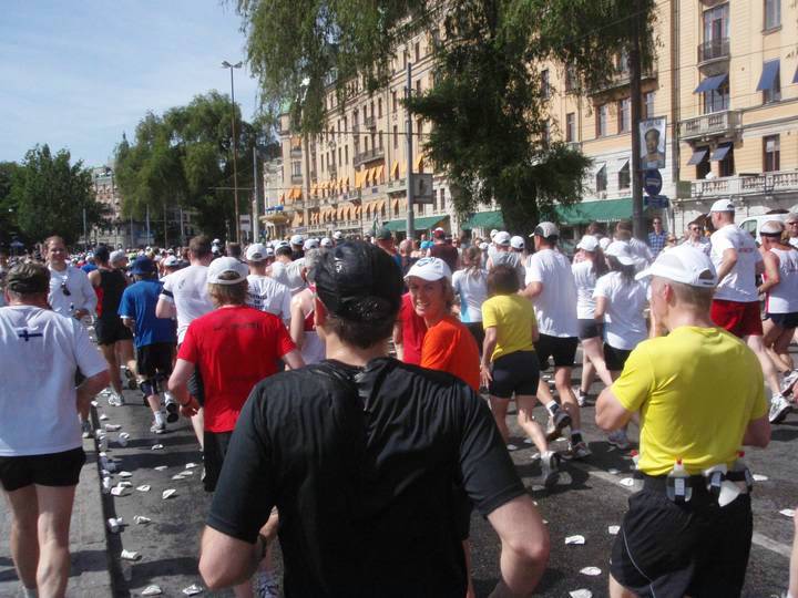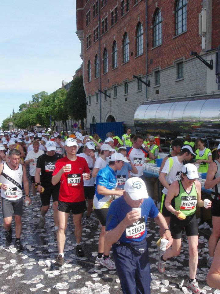 18 / 15.56 Uhr Odensgatan Wir hatten jetzt den Stadtteil Norrmalm erreicht und liefen auf der breiten Prachtstraße über Tausende zertretene Becher. Wie an jedem Verpflegungspunkt trank ich doppelt. Sehr gut: an fast jeder Stelle gab es neben Wasser auch isotonisches zu trinken. Ich nahm dann immer eins und eins. |