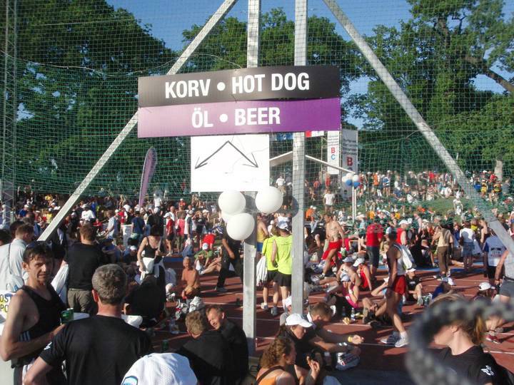 Auch Würstchen, Hot Dogs und Bier (!!) gehörten zur gratis Ziel- Verpflegung. Für mich war es etwas neues, so bald nach dem Finish schon etwas zu essen, aber ich machte es trotzdem. |
