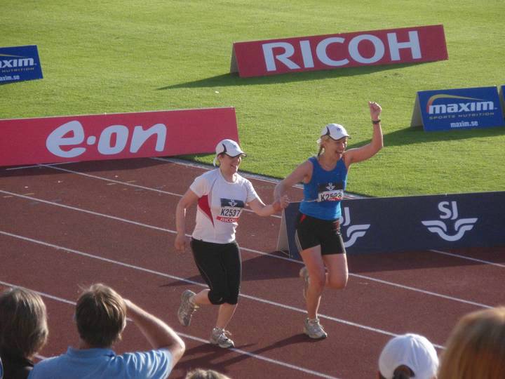 Hier kommen Sirpa Kytölä (links) und Kaija Kankaanpää (rechts), beide aus Finnland, ins Ziel. Zeit: 5:11:48 Stunden. Die Zwei sind vom Start an zusammen gelaufen, wenn auch vermutlich nicht Hand in Hand. |
