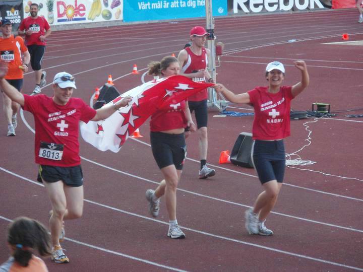 Guido Bumann aus der Schweiz vo "Swiss Running Team" (Endzeit: 5:39:32 Stunden) in Begleitung von Daniela Schuerch (finished etwas früher in 5:27:48 Stunden) und Naomi Vonlaufen (gab hinter Km 25 auf). |