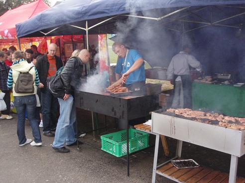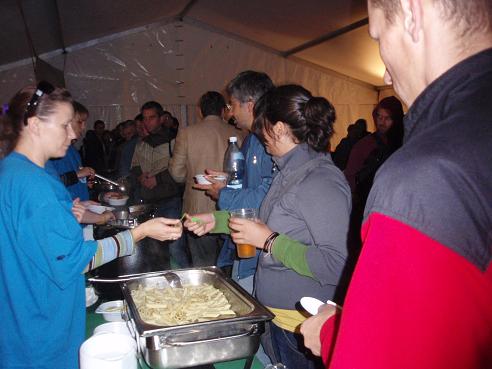 Uhr Wybrzeze Gdynskie / Rybaki Am Fuße der Neustadt (Nowe Miasto) war die Pasta-Party und die Feier-Meile am Abend aufge- baut. Hier in unmittelbarer Nähe war tags drauf auch das Ziel. Die Warteschlange hielt sich (anders als es das Foto vermuten läßt) in Grenzen. Nach knapp 15 Minuten war man dran. Die Pasta war im Startpreis inbegriffen. Die verführerisch duftenden Würste und Steaks am Stand nebenan waren aber zu bezahlen. |