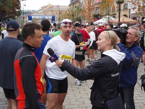 Przemiescie 8.53 Uhr Noch schnell ein paar Interviews fürs polnische Fernsehen, auf Klo und ab an den Start. 20 Höhenme- ter verliert man auf dem Kurs bis ins Ziel. Die Strecke ist also nicht rekordtauglich im strengen Sinne. Insgesamt ist sie aber auch so sehr schnell, da es fast ausschließ- lich flach voran geht. |