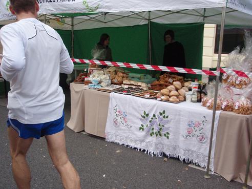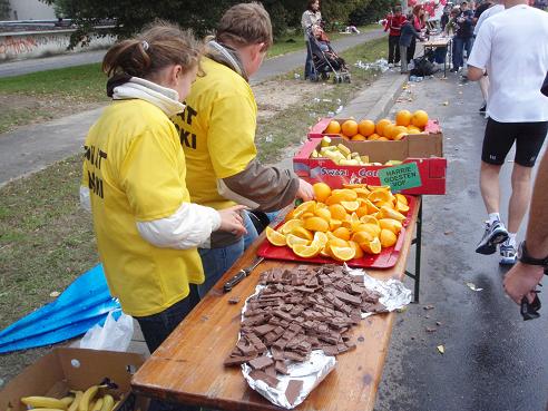 Swiat 9.06 Uhr / Kilometer 1,0 Hier bereitete man sich schon auf die Zeit nach dem Marathon vor. Die vielen leckeren Sachen waren aber auch für viele der vorbeilau- fenden Marathonies eine echte Versuchung. |