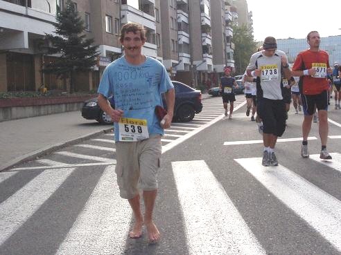 / plac Kransinskich 9.29 Uhr / Kilometer 4,5 Ein Barfußläufer. Ach du meine Güte. Und ich hatte mit mit Blick auf das Wetter sogar noch schnell die lange Laufhose angezogen. Irgendwas mit 1000 Kilometern und verschiedenen Marathons hatte er sich auf das Shirt gemalt. |