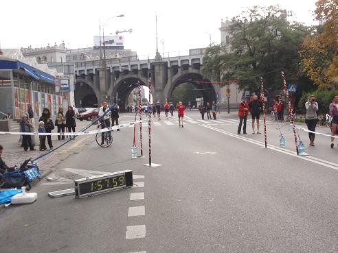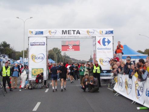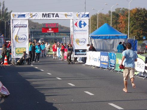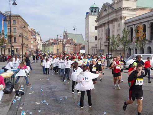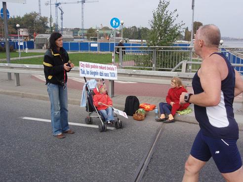 Gdynskie 12.46 Uhr / Kilometer 41,7 Hier ein Foto von einer Dame aus Österreich, die ihren Sohn aus Belgien zum Warschau-Marathon begleitete (das nenne ich gelebtes freies Europa!!). Während die leute, die mich eigentlich anfeuern wollten um 11.30 Uhr immer noch schliefen und es nicht schafften, an die Strecke zu kommen, sah ich die Dame, die ich schon von der Pasta-Party am Vortag kannte und ihre Freundin viermal an der Strecke. Das lag natürlich daran, daß der begleitete Sohn die ganze Zeit immer nur ein paar Minuten hinter mir lief. Mit Schwamm und Kamera bewaffnet flog ich dem Ziel entgegen. |