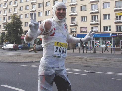 Marszalkowska 10.00 Uhr / Kilometer 10,5 Clows & Helden. Wie bei fast allen Marathons liefen auch in Warschau ein paar Verkleidete mit. Hier eine freundliche Mumie, die mit Schwert im Rücken an mir vorbeizog. Bei Km 27 hatte ich sie dann wieder eingeholt. |