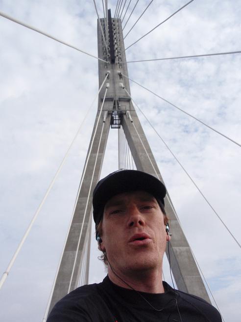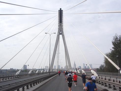Swietokrzyski 10.49 Uhr / Kilometer 19,5 Nach eher eintöniger Laufbahn auf der Ostseite ging es nun über "Europas schönste Brücke" (O- Ton des Veranstalters zurück über die Weichsel auf die Westseite. Also schön ist die Brücke schon, aber schönste Brücke Europas? |