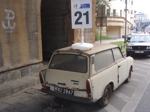 / Most Srednicowy 10.56 Uhr / Kilometer 21,0 Wozu die guten alten Trabis doch noch gut sein können. Und was wohl der Besitzer dazu sagt. Und das der Wagen das aushält. :-) |