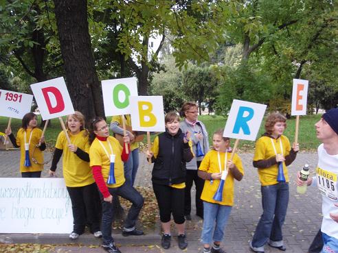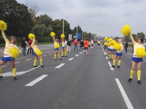 Rozbrat 11.04 Uhr / Kilometer 22,5 Verpflegungsstand Km 22,5. Die Verpflegung war durchweg sehr gut. Wasser, Iso, verschiedene Sorten Obst, teilweise Schokolade und andere Leckereien. Die Augen und Ohren hatte man aber immer woanders. Jedem Stand war eine Stimmungsgruppe ange- schlossen, die Radau ohne Ende machte. Cheerleader, Gymnastik- Gruppe, GoGo-Girls oder einfach "nur" Laut und Lustig wie hier. Für die Nicht-Polen: "Dobre" heißt übersetzt "gut". |
