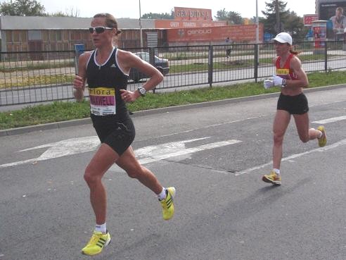 Czerniakowska 11.15 Uhr / Kilometer 24,5 Tanith Maxwell (Südafrika) und Elena Kozhevnikova (Rußland), die spätere Vierte und Fünfte der Damenwertung auf Gegenkurs bei ca. Km 37. Nach den Parks kam die Zeit der breiten und etwas öden Straßen. Ein paar Kilometer kam einem das Feld entgegen. Dann kam noch eine lange Schleife ganz im Süden. |